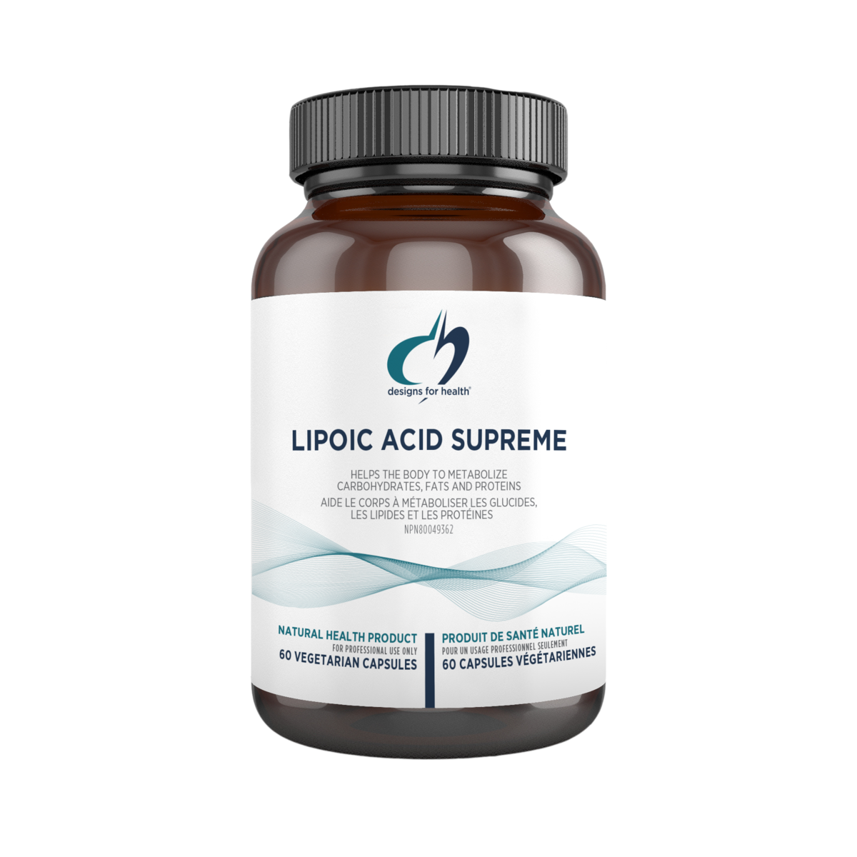 Lipoic Acid Supreme contient 300 mg d’acide lipoïque, ainsi que 4 mg de biotine pure et 500 mg de taurine, et est conçu pour contribuer à maintenir l’équilibre normal de la glycémie et de l’insuline. L’acide lipoïque est un composé soufré présentant des propriétés antioxydantes amphiphiles, ce qui le rend effi- cace tant dans les environnements à base d’eau que dans ceux à base de lipides. Cette propriété unique lui permet de neutraliser les radicaux libres dans les environnements hydrophiles et lipophiles, tels que le cytoplasme, les membranes plasmiques, le sérum et les lipoprotéines. L’acide lipoïque est surtout connu pour sa capacité antioxydante, mais il a également été démontré que cette molécule possède de puis- sants effets sur le contrôle de la glycémie via la sécrétion et la sensibilité à l’insuline, tout en contribuant à la détoxification des métaux.