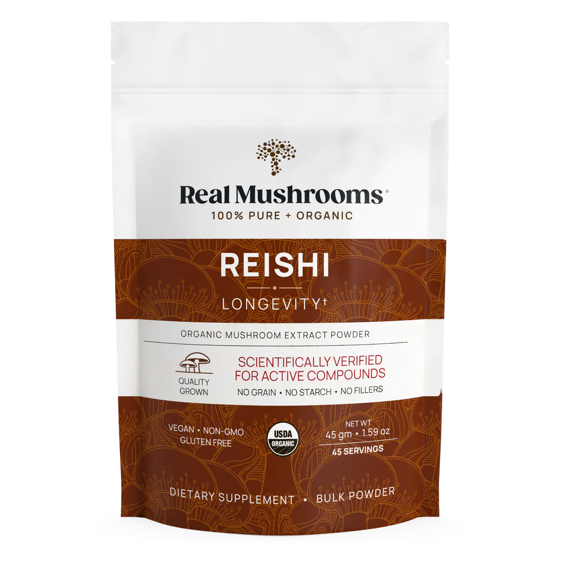 Le Real Mushrooms Reishi 415 garantit que leurs produits reishi sont fabriqués à partir du champignon (corps fruitiers) et contiennent des niveaux plus élevés du composé médicinal bêta-d-glucanes, des triterpènes et des charges de grains NO, contrairement à d'autres produits reishi sur le marché. Une façon d'identifier la pureté d'un produit reishi est la couleur foncée et le goût amer.